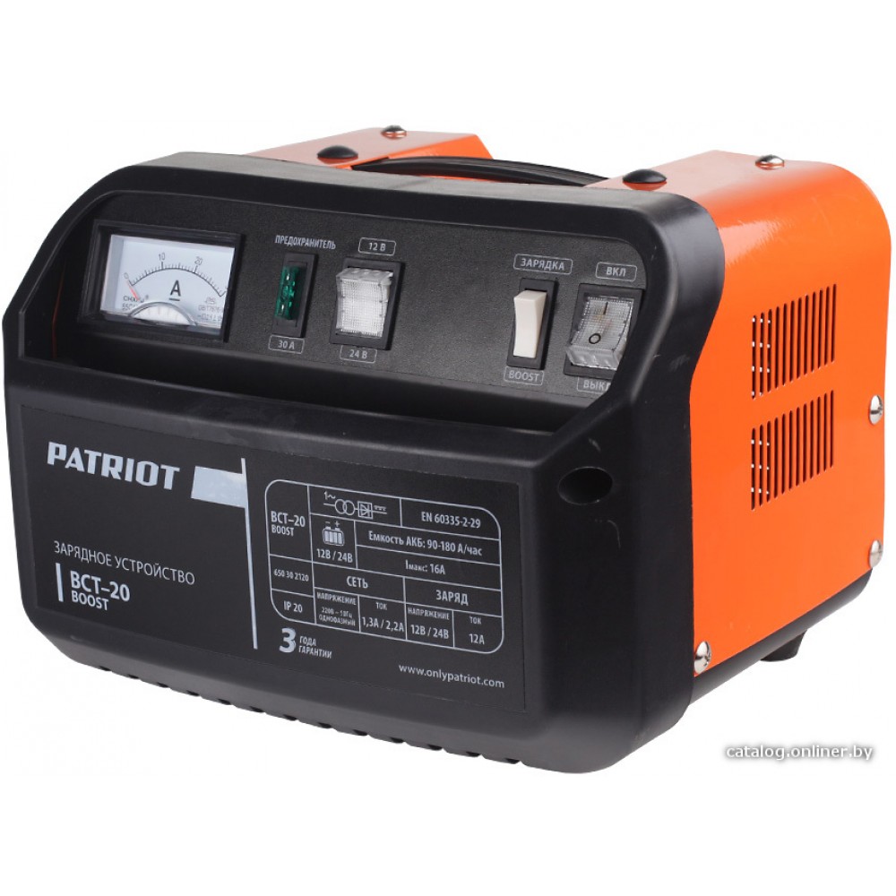 Общая информация Описание Описание Рекламное описание товара, взятое с сайта производителя, в котором кратко сообщается о предназначении и позиционировании модели на рынке. Устройство для бытового полупрофессионального или профессионального использования. Предназначено для зарядки свинцовых, кислотных аккумуляторов напряжением 12В и 24В. Ускоренный режим зарядки с повышенным током. Устройство высокого качества, удобно в использовании, оснащено переключателем напряжения, тока, амперметром, защитой от перегрузки, неправильной полярности, короткого замыкания. Отсек для хранения проводов. Основные Тип Тип Указывает на то, что устройство или только заряжает аккумулятор (зарядное) или может кроме заряда еще и запустить двигатель с севшим аккумулятором (пуско-зарядное). зарядное Емкость заряжаемых батарей Емкость заряжаемых батарей Емкость батарей, которую может зарядить устройство. 90 — 180 Ah Технические характеристики Напряжение Напряжение Убедиться, что напряжение питания источника соответствует напряжению прибора. 220 V Номинальное напряжение батареи Номинальное напряжение батареи Номинальное напряжение заряжаемых батарей. 12 V, 24 V Ток зарядки Ток зарядки Диапазон регулировки силы тока. 12 — 16 А Потребляемая мощность на заряд Потребляемая мощность на заряд Потребляемая мощность при заряде аккумулятора. 450 Вт Габариты и вес Вес Вес Масса прибора. 6.7 кг