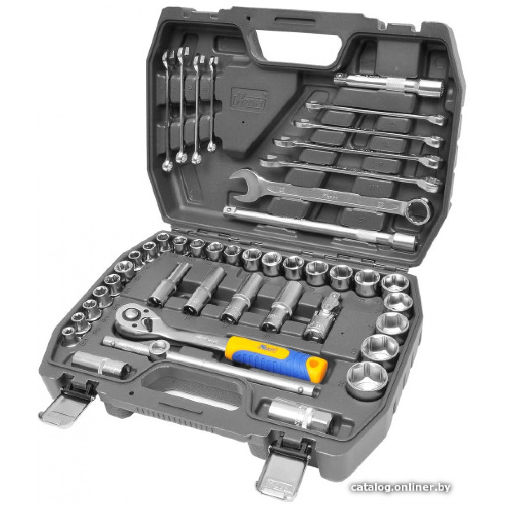 Общая информация Описание Описание Рекламное описание товара, взятое с сайта производителя, в котором кратко сообщается о предназначении и позиционировании модели на рынке. Набор инструмента 44 предмета базовой комплектации позволяет производить обслуживание резьбовых соединений в диапазоне размеров 8,10-32мм, а также профилем E-star (внешний TORX) E10,E12,E14,E16,Е18,Е20. Это полнофункциональный набор торцевых головок и принадлежностей для работы с приводом (12.7мм).Набор также оснащен комбинированными ключами следующих типо-размеров: 8,10-14,17,19,22мм. Набор предназначен для укомплектования автомобилей и проведения несложных работ по обслуживанию авто-мото-техники. Основные Тип набора Тип набора Тип набора инструментов. Различают как универсальные, общие наборы так и наборы отдельных инструментов. универсальный набор Посадочный размер (квадрат) Посадочный размер (квадрат) Торцевые головки и биты имеют квадратный хвостовик определенного типоразмера. Существует 5 стандартных типоразмеров посадочного квадрата, от 1/4 до 1 дюйма. 1/2' Количество предметов Количество предметов Количество предметов в наборе. 44 предмет(ов) Комплектация Комплектация Детальная комплектация. Цвет Цвет Основной цвет модели. желтый, синий Комплектация Торцевые головки 1/2' Торцевые головки 1/2' Стандартные торцевые головки. Имеют более низкий профиль, чем глубокие торцевые головки и позволяют получить доступ в более труднодоступных местах. 18 предмет(ов) Глубокие торцевые головки 1/2' Глубокие торцевые головки 1/2' Глубокие торцевые головки. Имеют более глубокий профиль, чем стандартные торцевые головки. 4 предмет(ов) Торцевые головки 1/2' Е-тип Торцевые головки 1/2' Е-тип Торцевые головки 1/2' Е-типа 6 предмет(ов) Трещотка Трещотка Инструмент для закручивания/откручивания гаек и болтов в любом направлении. (1/2') Т-образный вороток Т-образный вороток Вороток используется для «отспускания» или затяжки крепежа. 1/2' Кардан Кардан Кардан 1/2' Удлинители 1/2' Удлинители 1/2' Удлинитель 1/2'. 2 предмет(ов) Головки свечные 1/2' Головки свечные 1/2' Головки свечные 1/2'. 2 предмет(ов) Комбинированные ключи Комбинированные ключи Комбинированные ключи. 11 предмет(ов)