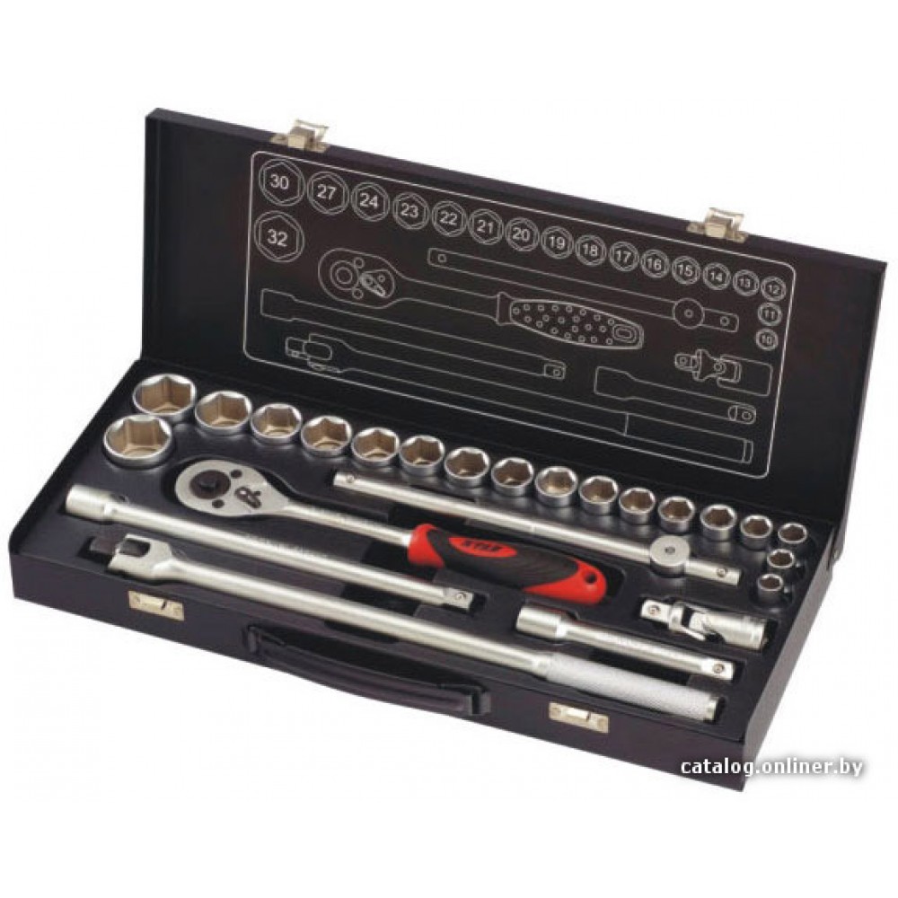 Общая информация Описание Описание Рекламное описание товара, взятое с сайта производителя, в котором кратко сообщается о предназначении и позиционировании модели на рынке. Набор торцевых головок 1/2' состоящий из 25 предметов. Основные Тип набора Тип набора Тип набора инструментов. Различают как универсальные, общие наборы так и наборы отдельных инструментов. набор торцевых головок Посадочный размер (квадрат) Посадочный размер (квадрат) Торцевые головки и биты имеют квадратный хвостовик определенного типоразмера. Существует 5 стандартных типоразмеров посадочного квадрата, от 1/4 до 1 дюйма. 1/2' Количество предметов Количество предметов Количество предметов в наборе. 25 предмет(ов) Комплектация Торцевые головки 1/2' Торцевые головки 1/2' Стандартные торцевые головки. Имеют более низкий профиль, чем глубокие торцевые головки и позволяют получить доступ в более труднодоступных местах. 18 предмет(ов) (10, 11, 12, 13, 14, 15, 17, 18, 19, 20, 21, 22, 23, 24, 27, 30, 32 мм) Трещотка Трещотка Инструмент для закручивания/откручивания гаек и болтов в любом направлении. 45 (1/2') (зубцов) Т-образный вороток Т-образный вороток Вороток используется для «отспускания» или затяжки крепежа. 1/2' Кардан Кардан Кардан 1/2' Удлинители 1/2' Удлинители 1/2' Удлинитель 1/2'. 2 предмет(ов) (125 мм, 250 мм) Вороток шарнирный 1/2' Вороток шарнирный 1/2' Вороток шарнирный 1/2'.