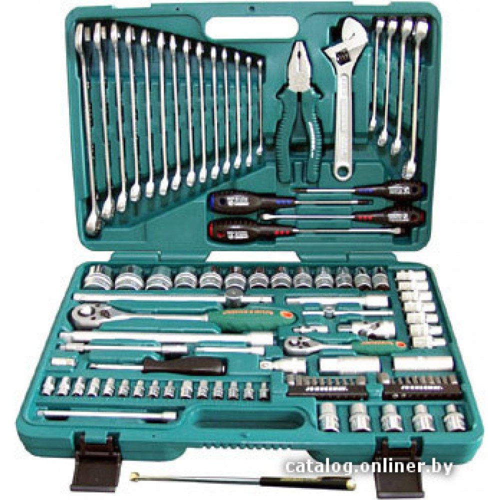 Общая информация Описание Описание Рекламное описание товара, взятое с сайта производителя, в котором кратко сообщается о предназначении и позиционировании модели на рынке. Применяется для производства комплексных слесарно-монтажных работ по монтажу, ремонту, техническому обслуживанию. Основные Тип набора Тип набора Тип набора инструментов. Различают как универсальные, общие наборы так и наборы отдельных инструментов. универсальный набор Посадочный размер (квадрат) Посадочный размер (квадрат) Торцевые головки и биты имеют квадратный хвостовик определенного типоразмера. Существует 5 стандартных типоразмеров посадочного квадрата, от 1/4 до 1 дюйма. 1/4', 1/2' Количество предметов Количество предметов Количество предметов в наборе. 101 предмет(ов) Комплектация Торцевые головки 1/2' Торцевые головки 1/2' Стандартные торцевые головки. Имеют более низкий профиль, чем глубокие торцевые головки и позволяют получить доступ в более труднодоступных местах. Торцевые головки 1/4' Торцевые головки 1/4' Стандартные торцевые головки. Имеют более низкий профиль, чем глубокие торцевые головки и позволяют получить доступ в более труднодоступных местах. Торцевые головки 1/2' Е-тип Торцевые головки 1/2' Е-тип Торцевые головки 1/2' Е-типа 5 предмет(ов) (Е11, Е12, Е14, Е16, Е18) Торцевые головки 1/4' Е-тип Торцевые головки 1/4' Е-тип Торцевые головки 3/8' Е-типа 6 предмет(ов) (Е4, Е5, Е6, Е7, Е8, Е10) Трещотка Трещотка Инструмент для закручивания/откручивания гаек и болтов в любом направлении. (1/2', 1/4') Т-образный вороток Т-образный вороток Вороток используется для «отспускания» или затяжки крепежа. 1/2', 1/4' Кардан Кардан Кардан 1/2', 1/4' Удлинители 1/2' Удлинители 1/2' Удлинитель 1/2'. 2 предмет(ов) (125 мм, 250 мм) Удлинители 1/4' Удлинители 1/4' Удлинители 1/4' 2 предмет(ов) (75, 150 мм) Головки свечные 1/2' Головки свечные 1/2' Головки свечные 1/2'. 2 предмет(ов) (16, 21 мм) Гибкий удлинитель 1/4' Гибкий удлинитель 1/4' Гибкий удлинитель 1/4'. Адаптер для вставок (бит) Адаптер для вставок (бит) Адаптер для вставок (бит) 1/4' Комбинированные ключи Комбинированные ключи Комбинированные ключи. 14 предмет(ов) (8, 10, 11, 12, 13, 14, 15, 16, 17, 18, 19, 21, 22, 24 мм) Разрезные ключи Разрезные ключи Разрезные ключи. 8x10 мм, 11x13 мм, 12x14 мм, 17x19 мм Магнитный извлекатель Магнитный извлекатель Магнитный извлекатель. Пассатижи Пассатижи Пассатижи. 1 предмет(ов) (7') Ключ разводной Ключ разводной Ключ разводной. (200 мм) Отвертки Отвертки Отвертки различают PH — крестообразная, SL — «плоская», «минусовая» и PZ — крестообразная отвертка с дополнительными направляющими. 4 предмет(ов)(PH, SL) Отвертка под биты Отвертка под биты Отвертки под биты. 1/4' Биты (насадки-отвертки) Биты (насадки-отвертки) Биты - короткие насадки-отвертки. (Hex, Torx, Spline)